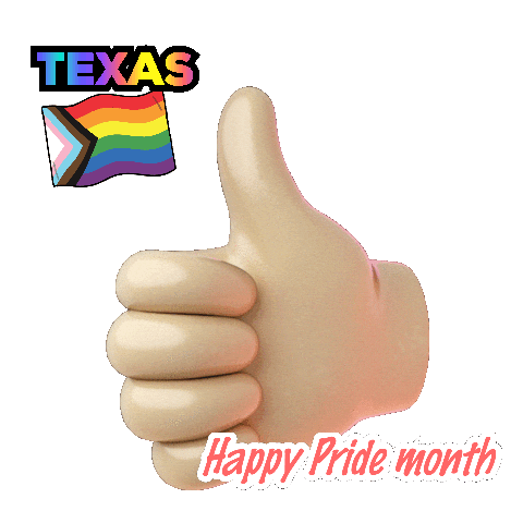 A thumbs up emoji hand with sparkles, a Progress Pride flag, and 'TEXAS Happy Pride month' text, celebrating Pride.