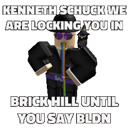 Kenneth Schuck is locked in Brick Hill, held captive until he says 'BLDN'. A meme featuring a Roblox character.