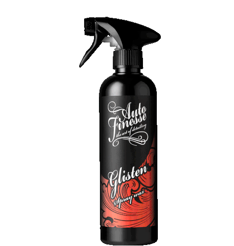 An animated sticker featuring an Auto Finesse Glisten spray wax bottle with a car, perfect for vehicle detailing enthusiasts.