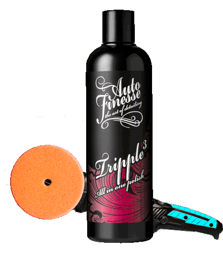 Autofinesse Tripple³ all-in-one polish for vehicle detailing, featuring the product bottle, polishing pad, and tool.