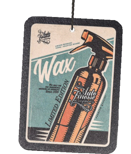 An animated sticker of an Auto Finesse 'Wax Limited Edition' car air freshener, featuring a spray bottle design.