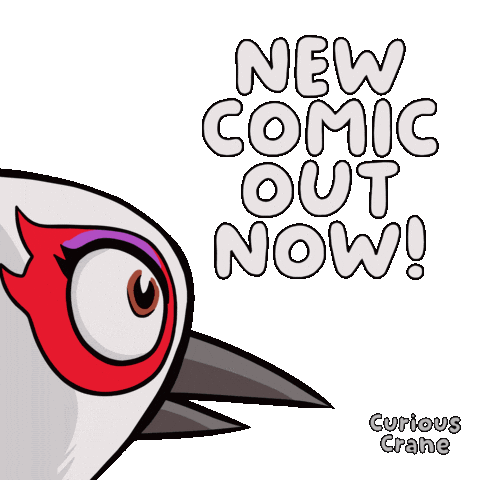 Curious Crane announces a new comic release, with the bird blinking excitedly to promote the fresh drop.