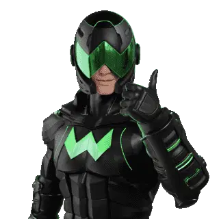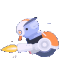 A cute mini robot character riding a single-wheeled vehicle with a rocket booster, emitting yellow flames.