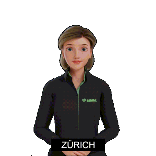 A Signtime avatar, a woman in a black jacket, points while "ZÜRICH" is displayed below her.