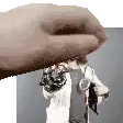 Pochaccoo the white dog sits calmly with a small yellow chick perched adorably on its head.