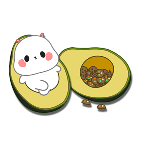 An adorable white character with horns sits inside an avocado half, next to another half filled with colorful cherries.