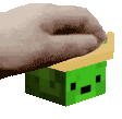 A pixelated green Avxcqdo avocado block from Minecraft winks playfully while being held by a hand.
