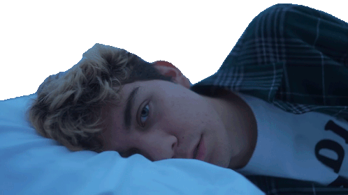 A young man with blonde hair and blue eyes lies awake on a white pillow, looking directly at the viewer.