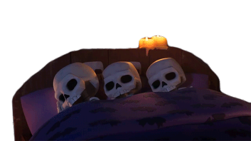 Three cartoon skeletons in a bed, under a dark blanket, slowly stirring and waking up with a candle light.