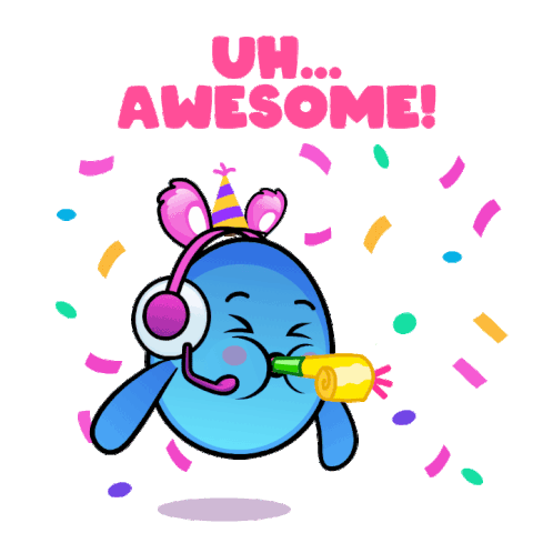 A cute blue character with headphones and a party hat blows a party horn, celebrating with "UH... AWESOME!" text.