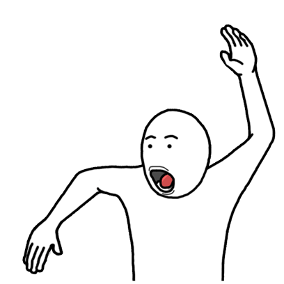 A simple line drawing of a person with a wide-open mouth and raised arm, expressing shock or surprise.