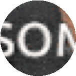 A pixelated, blurry close-up of a circular image displaying the white text 'SON' on a dark background.