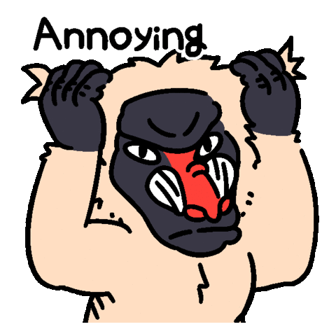 An angry cartoon mandrill holds its head, expressing frustration with the word "Annoying" above it.