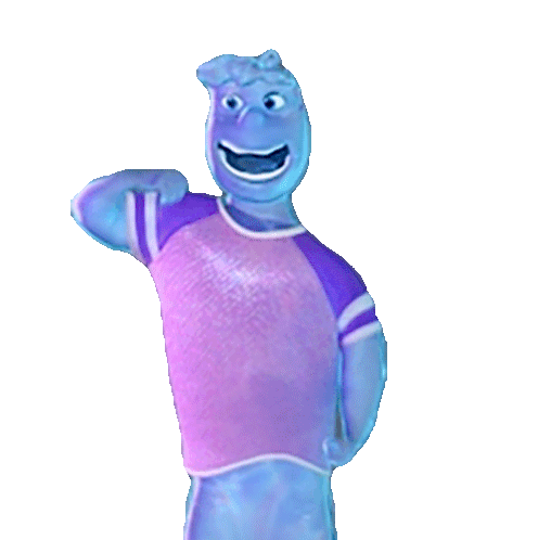 Wade, the water elemental, laughs awkwardly with a hand behind his head, wearing a pink and purple shirt.