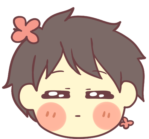 An adorable anime-style character with brown hair and pink flowers, featuring rosy cheeks and a slightly tired or unimpressed expression.