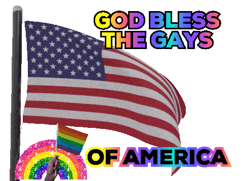 An American flag waving alongside a rainbow flag and a glittery rainbow, with the text 'GOD BLESS THE GAYS OF AMERICA' celebrating LGBTQ+ pride.