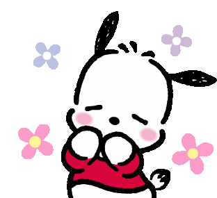 Adorable Pochacco character with rosy cheeks, clasping hands shyly amidst floating pink and purple flowers, expressing gratitude.