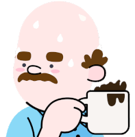 A bald man with a mustache is sweating while drinking from a white mug, looking stressed or surprised.