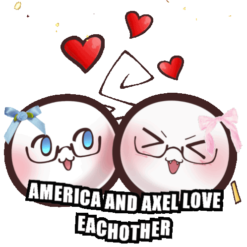 America and Axel, two cute cartoon characters, express their love for each other with hearts and confetti.