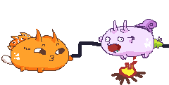 An Axie Infinity Axie blows a kiss while pulling another Axie towards a BBQ campfire, a playful and cute sticker.
