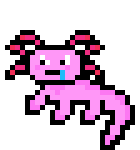 An adorable animated sticker featuring a pink pixel art axolotl with distinctive red gills and a wagging tail.