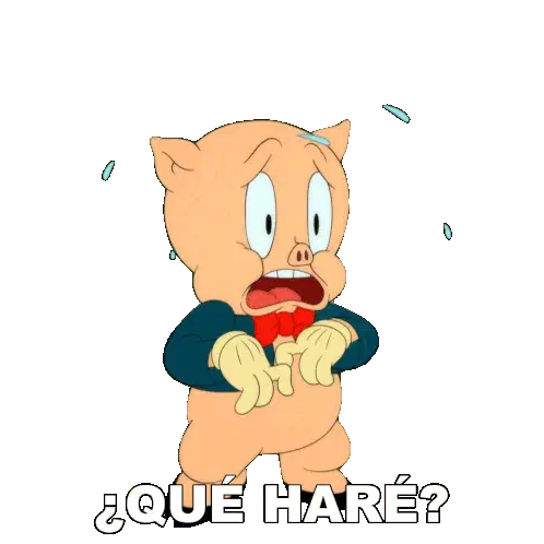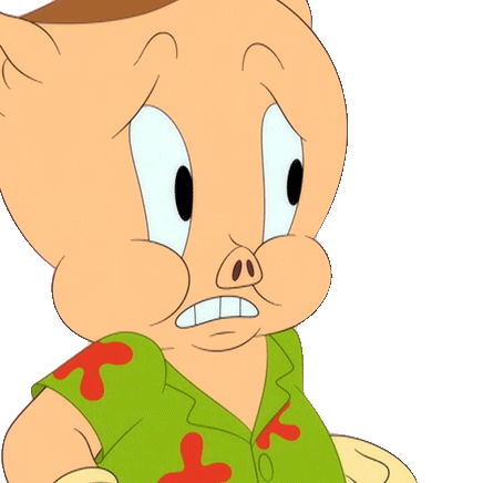 Porky Pig looks stressed and exasperated, reacting with a wide-eyed stare and then a gasp of shock.