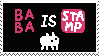 A pixel art sticker featuring 'BABA IS STAMP' text and a white pixel monster on a black background with a retro border.