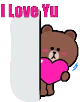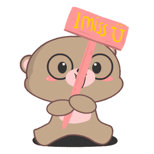 A cute, blushing baby brown bear holds up a pink sign with 'I miss U' written in yellow letters.