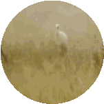 A large elephant moves through a field, with a white egret visible in the background, captured within a circular frame.