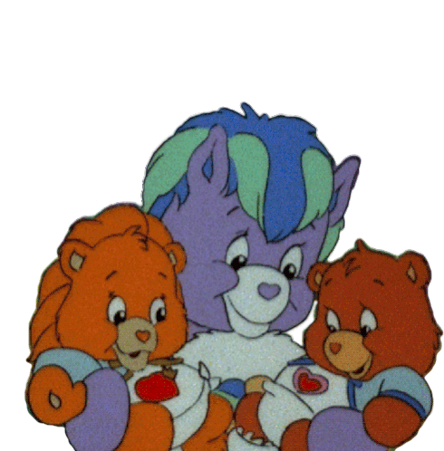 Noble Heart Horse lovingly holds Brave Heart Lion and Tenderheart Bear, embodying a caring babysitter role from the Care Bears universe.