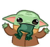 Baby Yoda, also known as Grogu, happily eats a green frog, eyes closing in satisfaction. A cute animated sticker.