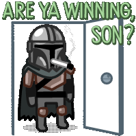 A pixel art Baby Yoda (Mandalorian) character smoking, asking 'Are ya winning, son?' from a doorway, a popular meme.