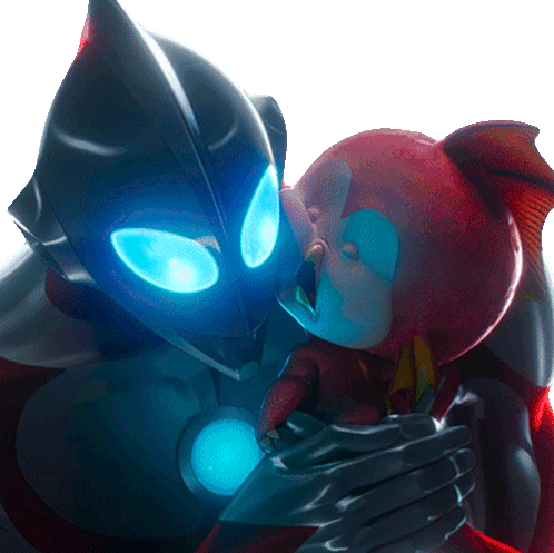 Ultraman from Ultraman Rising tenderly cradles the adorable baby Kaiju Emi, a heartwarming moment of care.