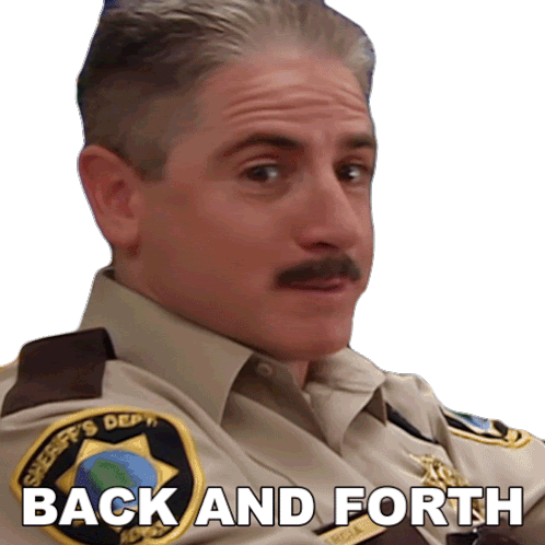 Deputy James Garcia from Reno 911 looks around with a 'Back And Forth' caption, perfect for indecision or repetition.