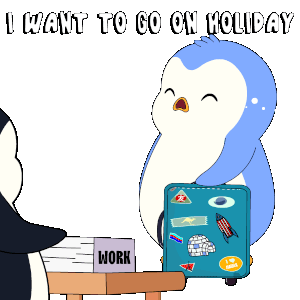 A tired and sad penguin stands next to a desk with a "WORK" sign, expressing reluctance to go back to work.