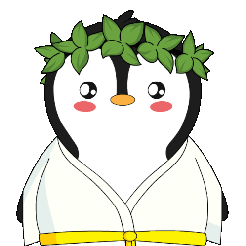A cartoon penguin, wearing a laurel wreath and toga, has daggers in its back, symbolizing betrayal.