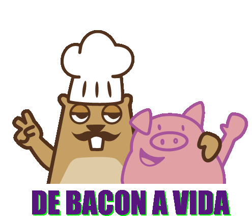 A chef beaver and a happy pig cartoon characters with the text "DE BACON A VIDA" (FROM BACON TO LIFE).
