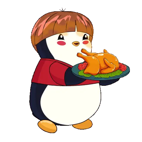 A cute, round cartoon lion happily devours a large chicken drumstick, with messy bits around its mouth, in this animated sticker.
