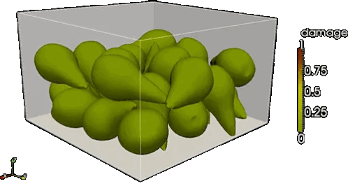 An abstract 3D animation depicting multiple pear-like shapes within a transparent box, showing areas of increasing red 'damage' over time.