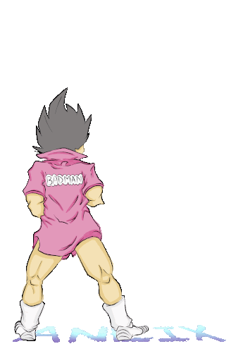 Badman Vegeta from Dragon Ball Z, wearing his iconic pink shirt, performs a workout with a dumbbell.