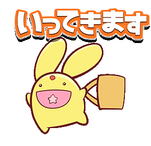 Puyo Puyo's adorable Carbuncle character waves goodbye, holding a bag, with the Japanese phrase 'Ittekimasu'.