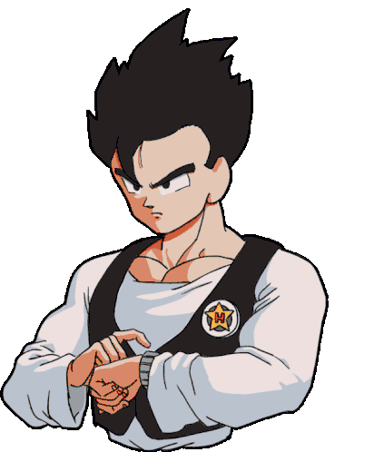 Gohan, as the Great Saiyaman from Dragon Ball, checks his watch with a serious expression, ready for action.