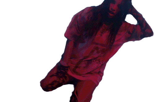 Emilia performs a suggestive dance, moving her body in a red top. A dynamic sticker for expressing rhythm.