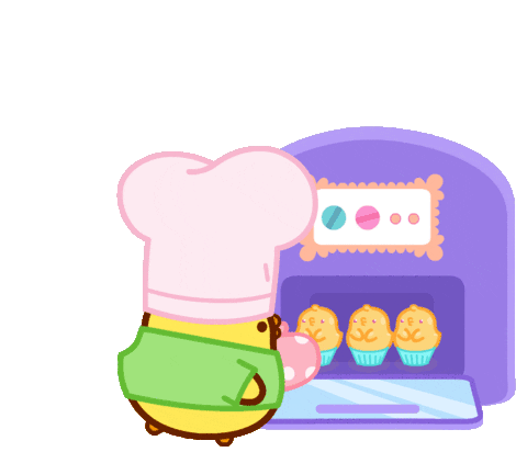 A cute Molang chick, dressed as a chef, happily bakes cupcakes, closing the oven door with a pink mitt. A sweet cooking moment.
