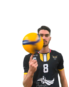 Rebeyrol, a male volleyball player, skillfully spins a volleyball on his finger.