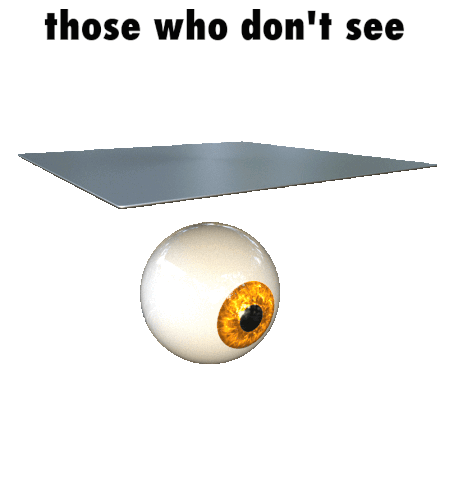 An animated eye is covered by a metallic sheet, then a draped cloth, illustrating the phrase 'those who don't see'.