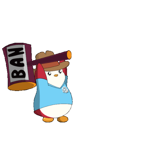 A cute Pudgy Penguin in a cowboy hat swings a large ban hammer, enforcing moderation with a powerful strike.