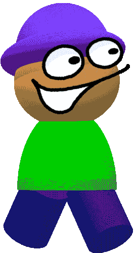 Bandu, a character from the Dave and Bambi FNF mod, with a purple hat, green shirt, and wide smile.