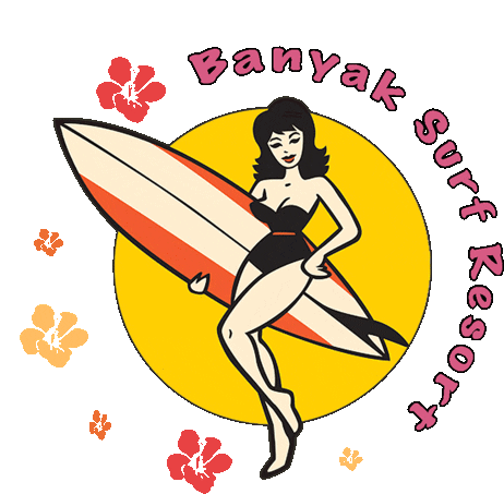 Retro-style logo for Banyak Surf Resort featuring a pinup woman in a swimsuit holding a surfboard.