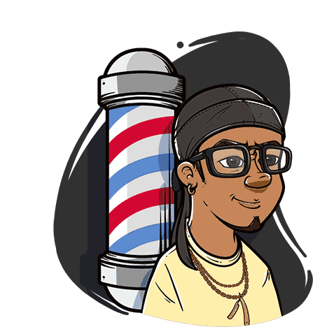 A friendly cartoon barber character with glasses and a durag, smiling next to a classic red, white, and blue barber pole.